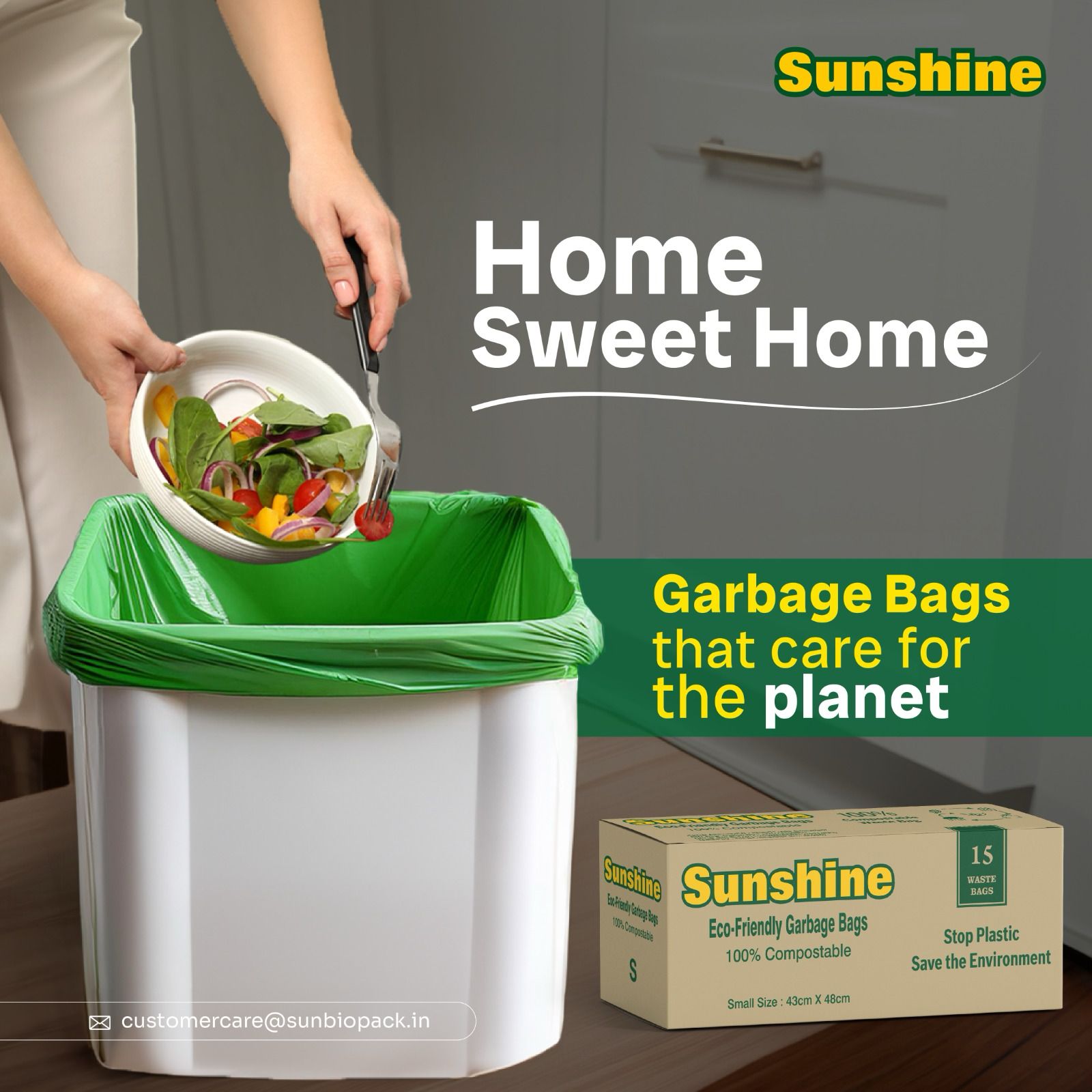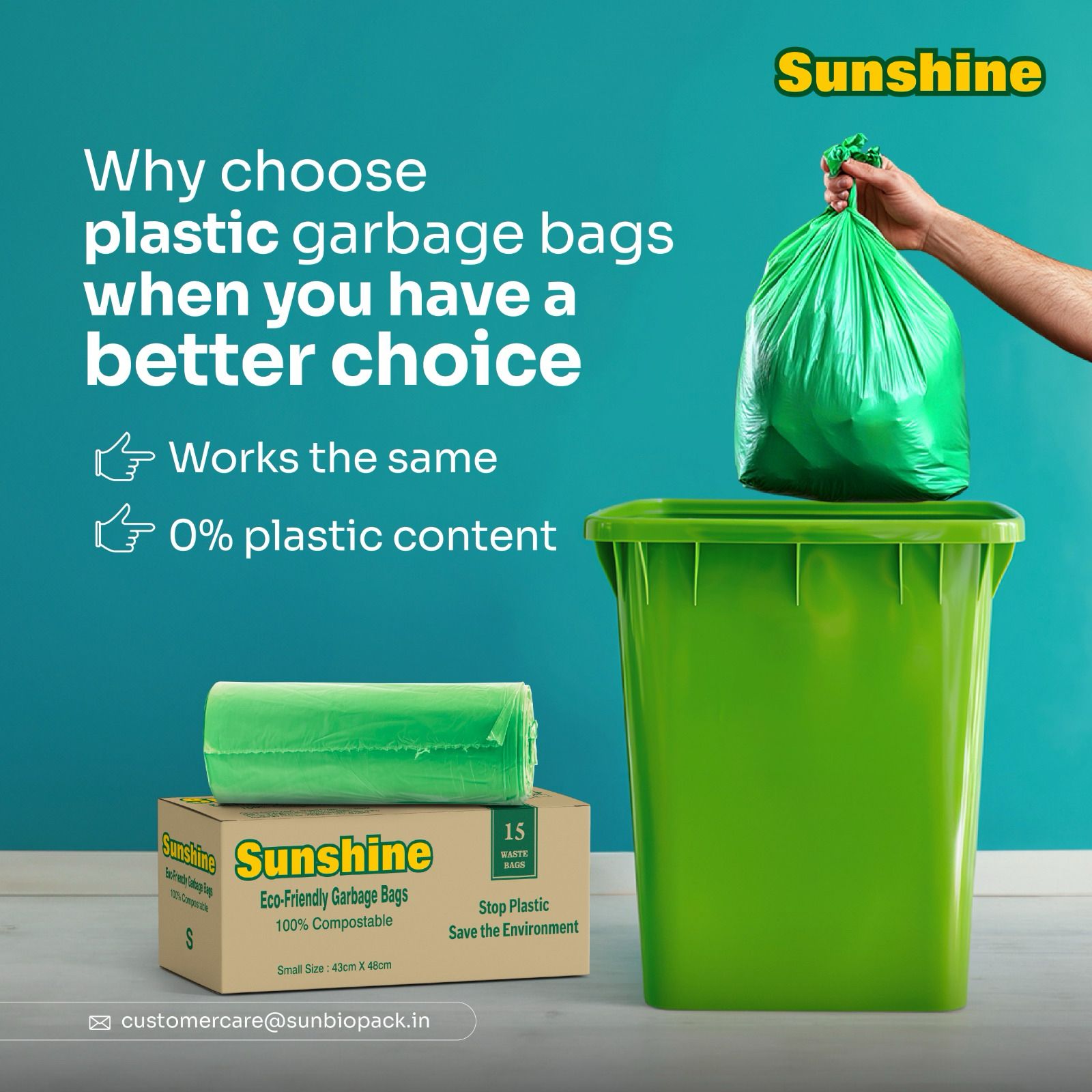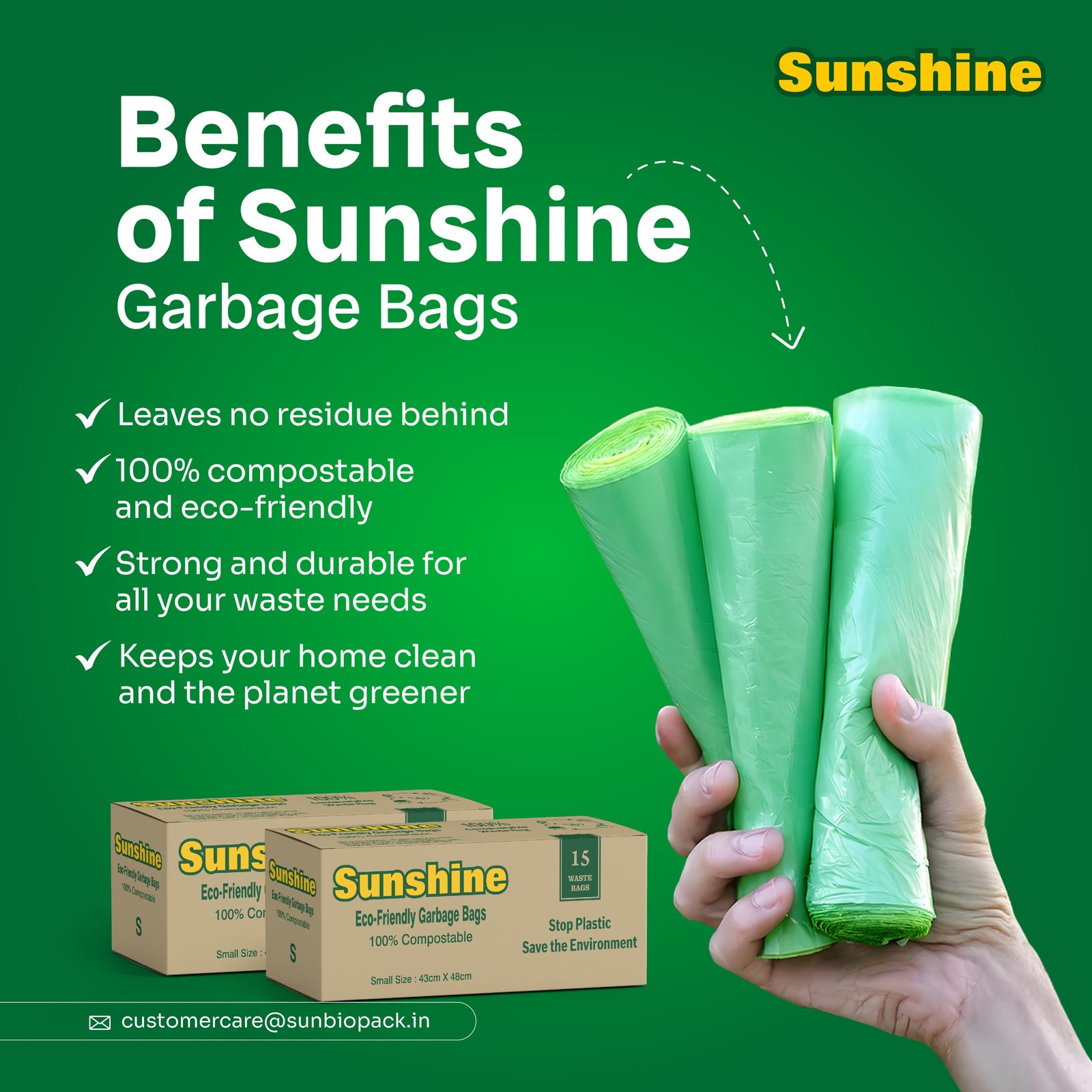 That’s why we created Sunshine Garbage Bags — our flagship product and India’s trusted name in 100% compostable garbage bags. Designed to replace conventional plastic waste bags, these eco-friendly alternatives are made from natural, plant-based materials that break down safely and efficiently in composting environments.
